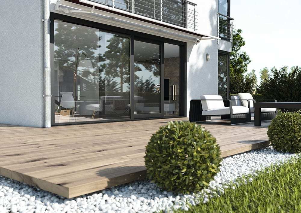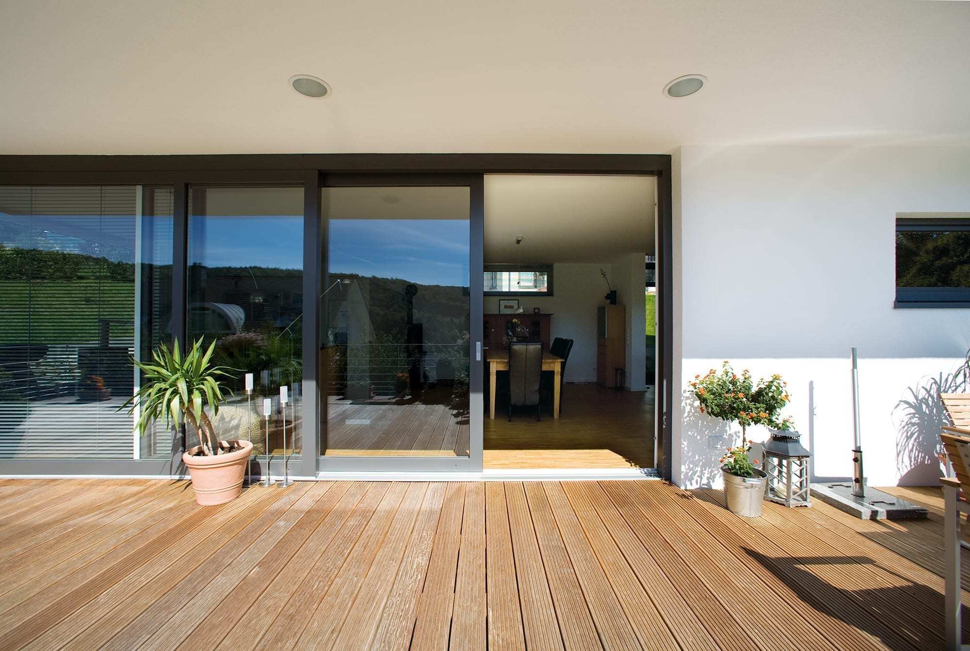 Skrzydła składają się jak harmonijka, otwierając całą ścianę na szerokość do 6 metrów. Idealne do całkowitego połączenia salonu z tarasem. Dom staje się częścią ogrodu.