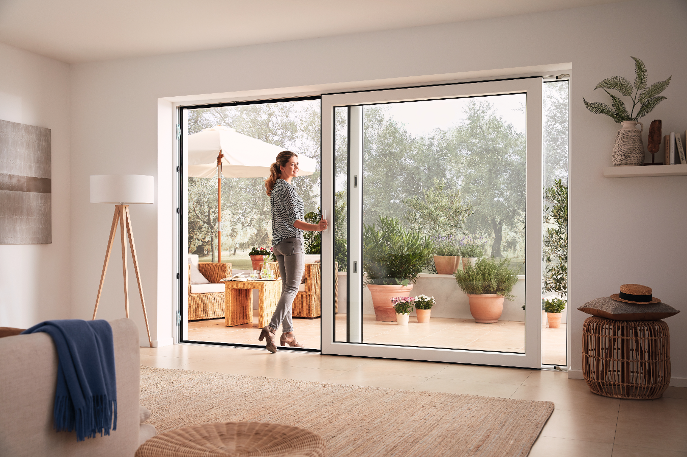Skrzydła składają się jak harmonijka, otwierając całą ścianę na szerokość do 6 metrów. Idealne do całkowitego połączenia salonu z tarasem. Dom staje się częścią ogrodu.